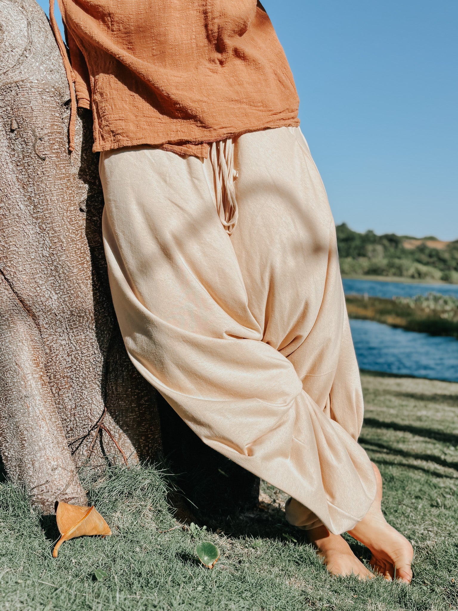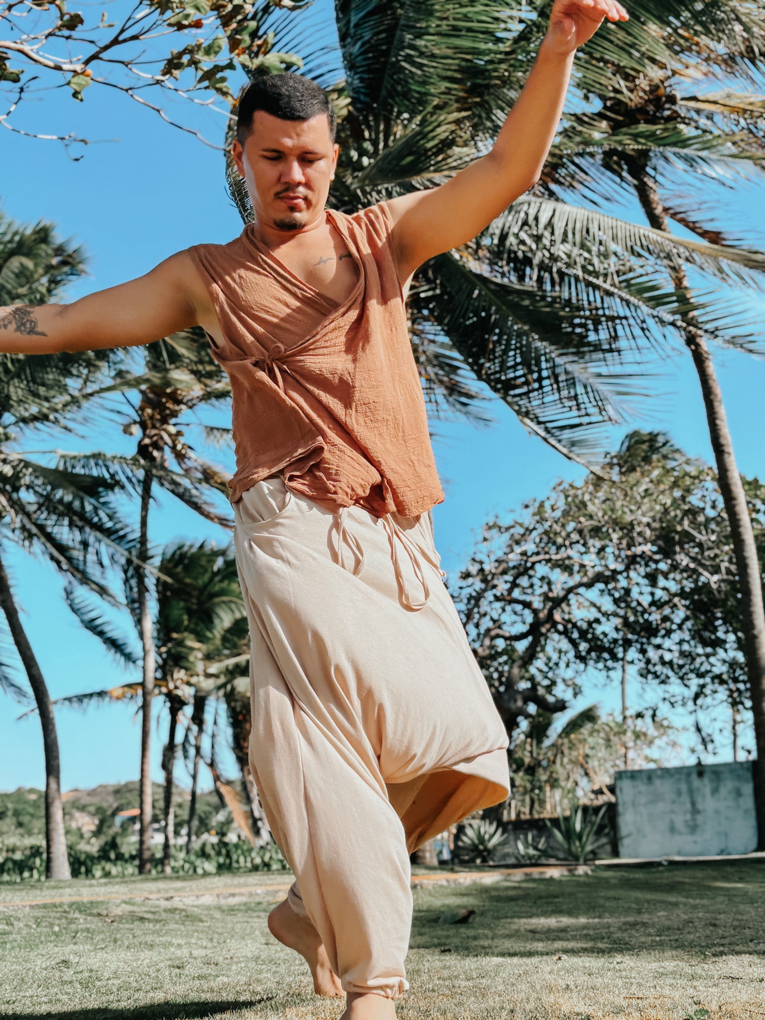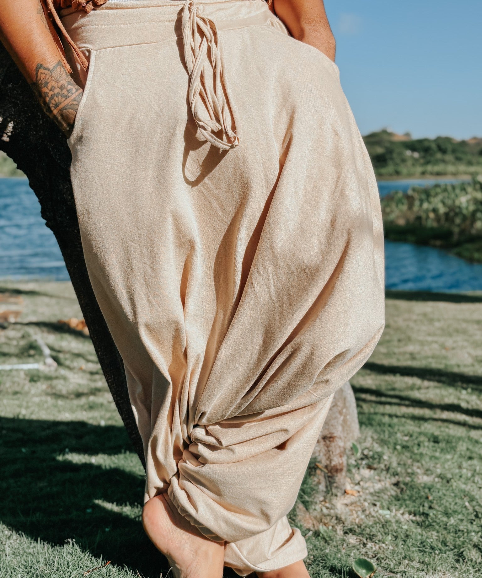 Calça Goa Shiva: uma peça que transcende o convencional. Confeccionada em algodão penteado de qualidade superior.
