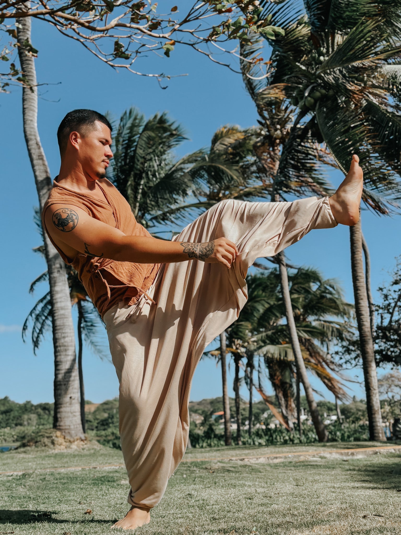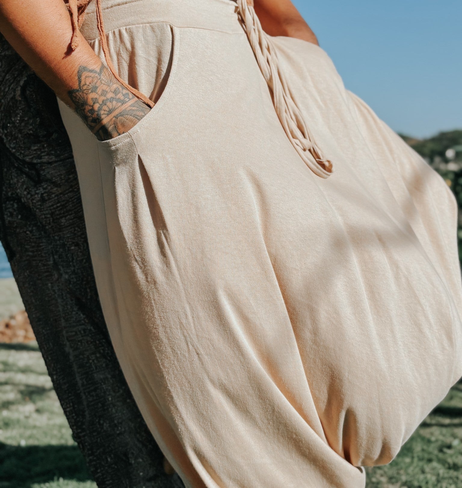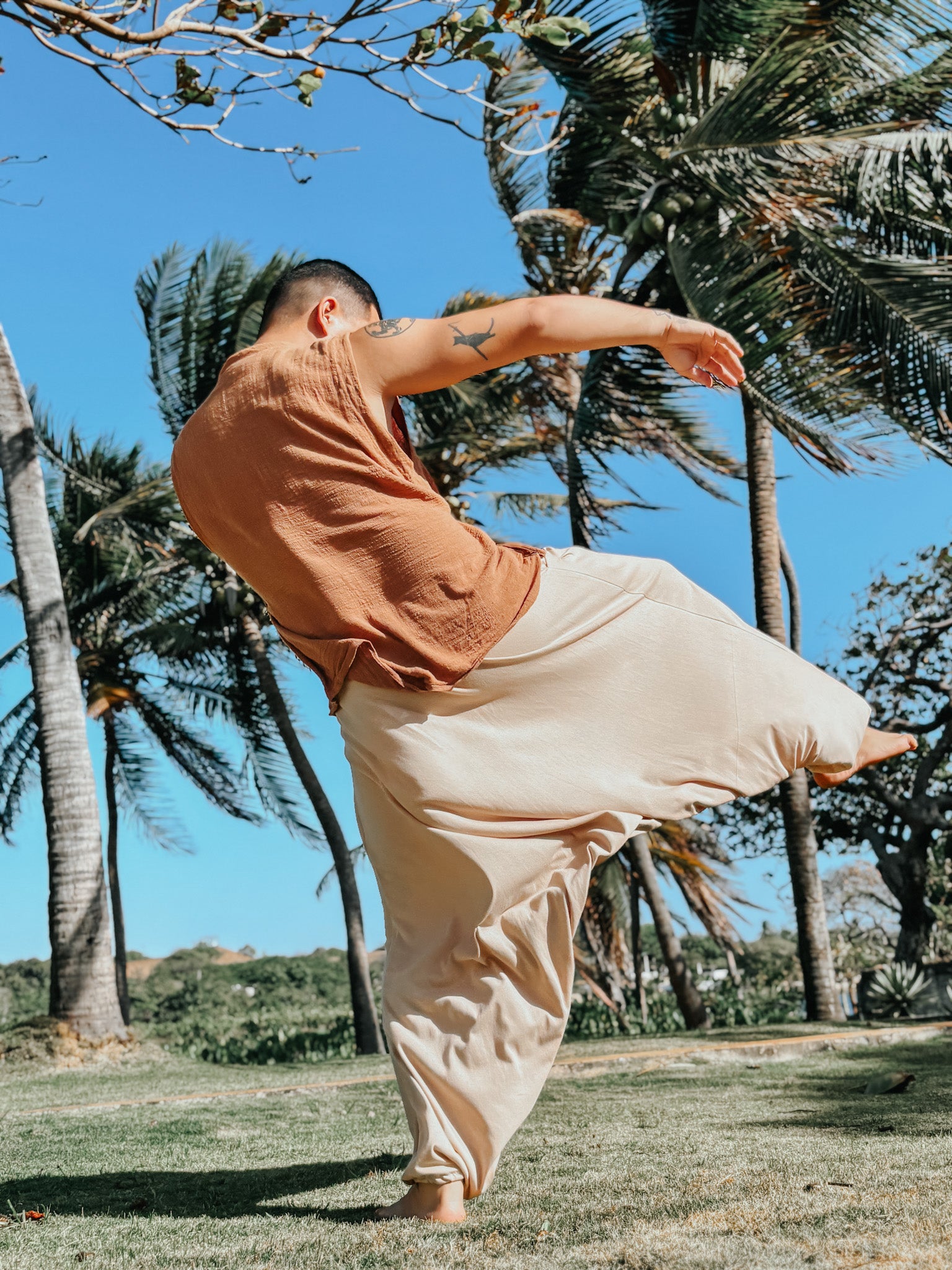 Calça Goa Shiva: uma peça que transcende o convencional. Confeccionada em algodão penteado de qualidade superior.