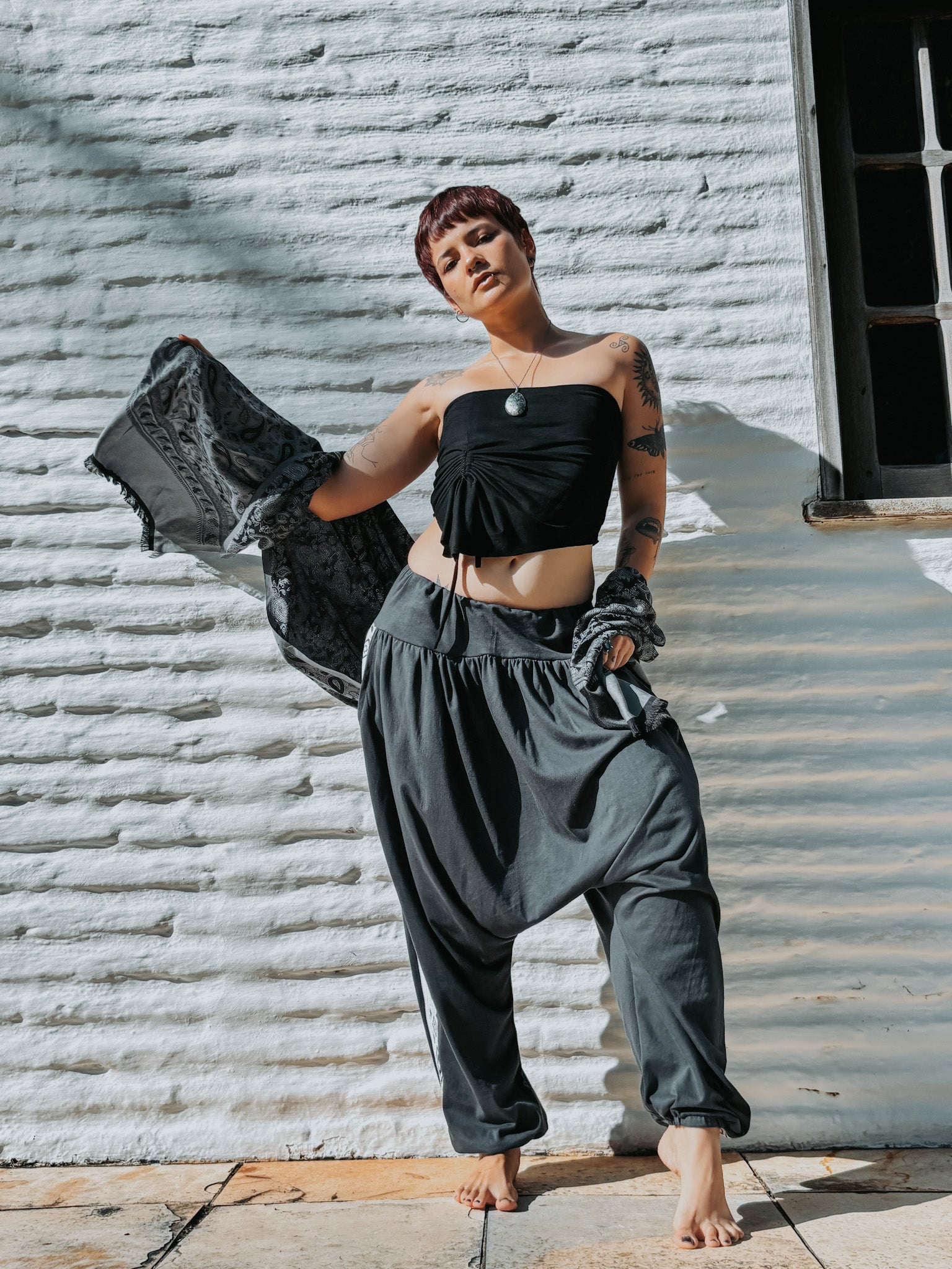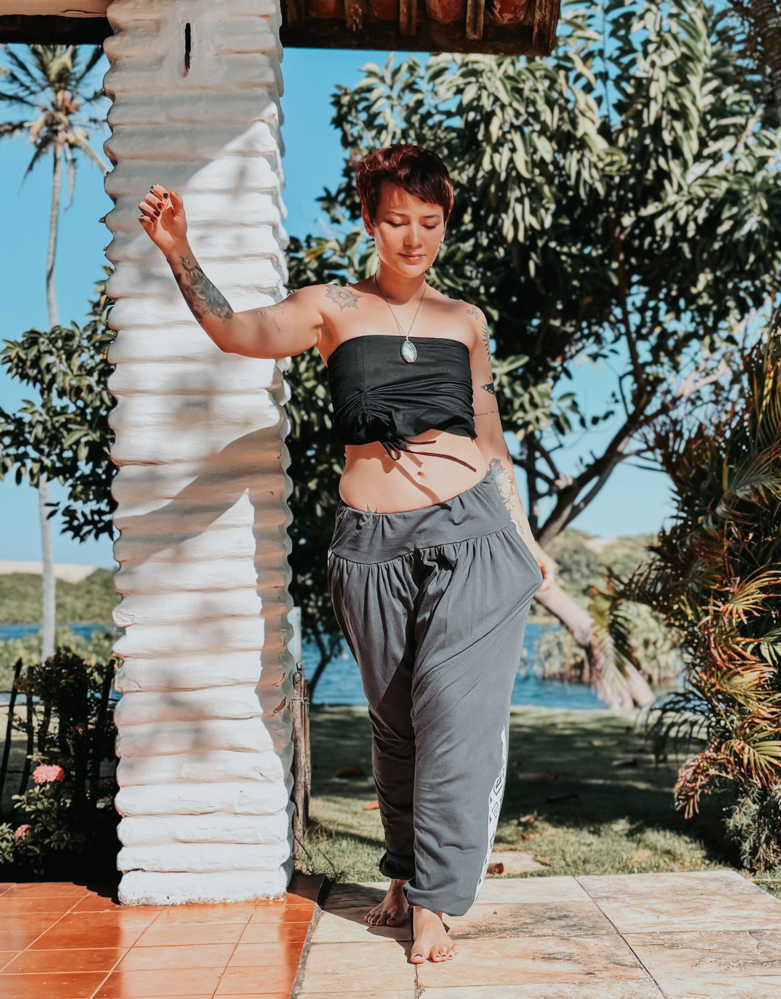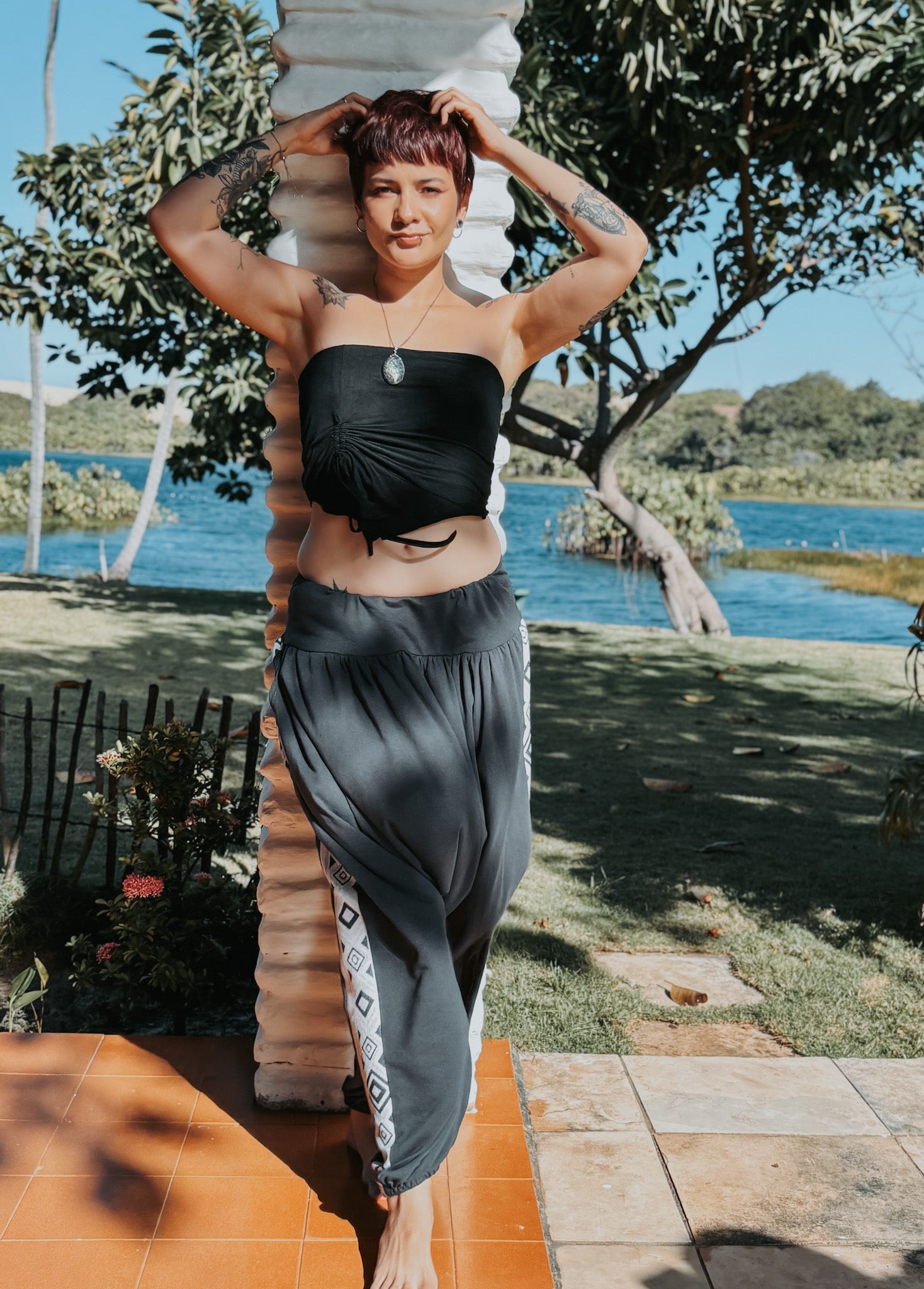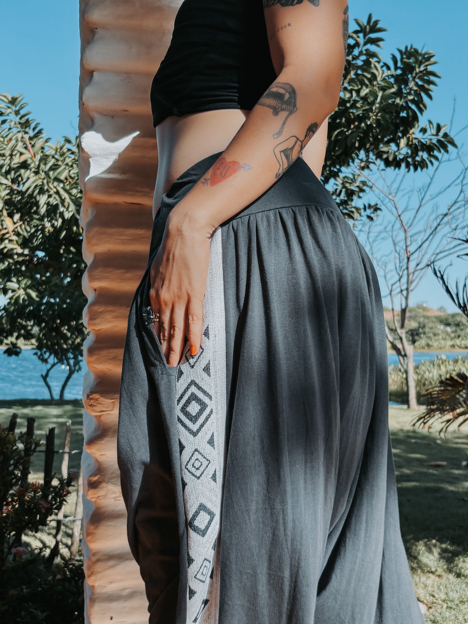 Calça Thai em algodão penteado de alta qualidade, confeccionada em tom chumbo discreto e versátil. Trata-se de um modelo mais básico, adicionado de faixa étnica lateral exclusiva da loja, elemento característico do design Thai que adiciona autenticidade sem excessos.